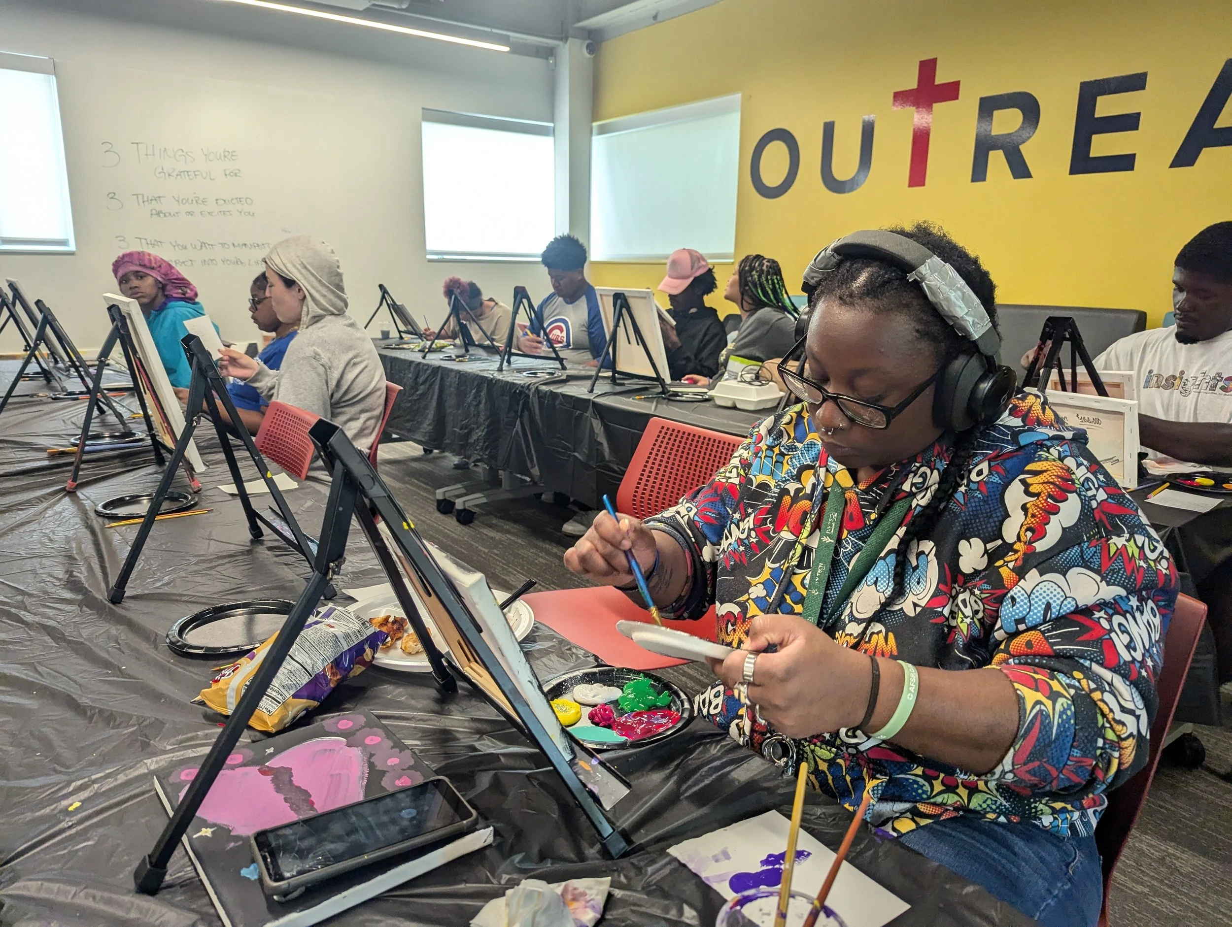 Outreach’s art program has also been a safe harbor for Sharese to express the complex feelings she has inside. One of her favorite pieces she calls Beautifully Broken. “The cracks are the beauty,” she said. “They make me beautiful.” Each color carries a specific meaning: red for anger, blue for tears, purple as a Band-Aid, hiding her pain behind a smile. Another work, Beautiful Disaster, is layered with glitter, capturing emotion in both chaos and calm. For Sharese, art is a reflection of her inner world, serving as a way to make sense of both struggle and joy.